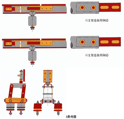 近代工業(yè)中,起重機(jī)噸位日益增大,運(yùn)行距離也愈來(lái)愈長(zhǎng),如何處理滑觸線上的電壓降不超過(guò)允許值問(wèn)題,需要設(shè)計(jì)過(guò)程中妥善解決。過(guò)去解決電壓降過(guò)大的方法,不外乎采用:加大滑觸線和供電線路的截面;增加滑觸線上的供電點(diǎn)數(shù);縮小三根滑觸線之間的相間距離等等,但這些措施往往收效甚微或很不經(jīng)濟(jì),這是因?yàn)榛|線路中的電抗值難以降低,所以先要解決如何減少滑觸線路上的電抗值著手。本公司同有關(guān)設(shè)計(jì)單位一起,研究國(guó)外資料,在剛體滑觸線上的基礎(chǔ)上,添加兩根輔助電纜,組成低阻抗滑觸線后,可使線路阻抗值成倍地降低(根據(jù)不同規(guī)格的剛體添加不同截面的電纜后,其阻抗值可以降低到原來(lái)的1/2-1/3)下面為低阻抗滑觸線的簡(jiǎn)要配置圖: